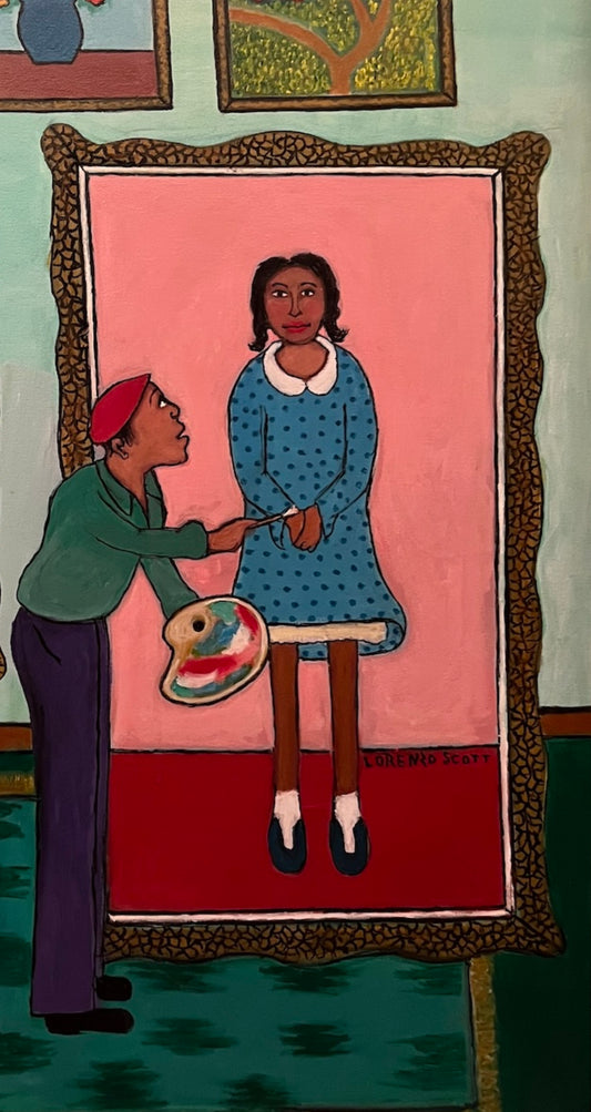Folk artist, Lorenzo Scott was born on July 23, 1934, in the small mill village and railroad hub of West Point, Georgia. When his mother, who worked in the fields supplying cotton to the local mills, lost her job during the Depression, the family moved to Atlanta, GA in search of work. One of eleven children, Mr. Scott tells of a time in his youth when he first saw his mother make a sketch, and knew even at an early age that he wanted to be able to draw like that. In his youth, Lorenzo's family lived across the street from a Southern Baptist church where they were active members. Here the young Lorenzo developed the lifelong devout Christian faith that underpins both his art and his life. He often tells stories of extraordinary events that have occurred in his life which stem from his strong faith. In one such story, he reflects on a time when as a child he would observe the comings and goings of churchgoers across the street, and how after observing a funeral gathering at the church, he asked his mother "how come people had to die." He thought if he stayed awake, he wouldn't die, so one night he got his mom to let him stay up all night.
