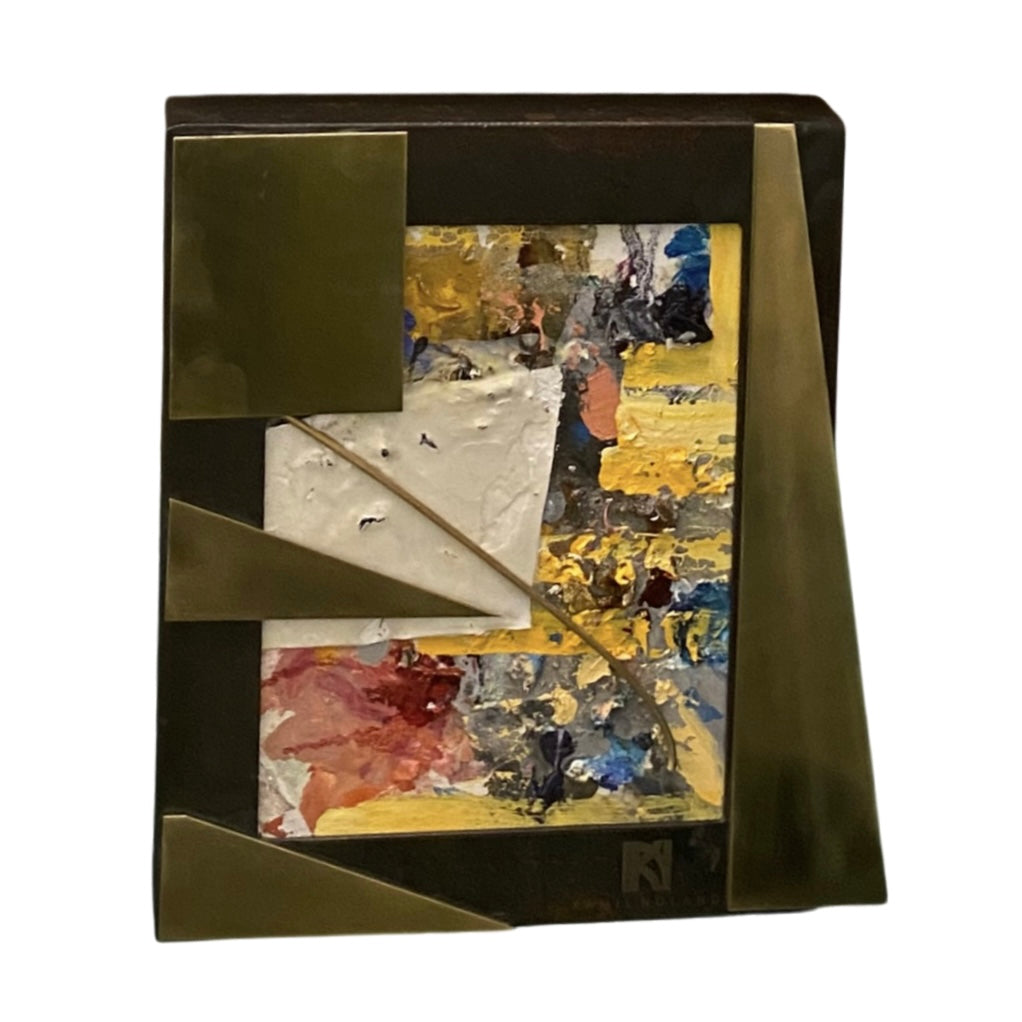 Collaborative abstract work of art on canvas surrounded by a wood, steel, and brass sculpture by Kamil Noland. This work of art measures 10”x12”.