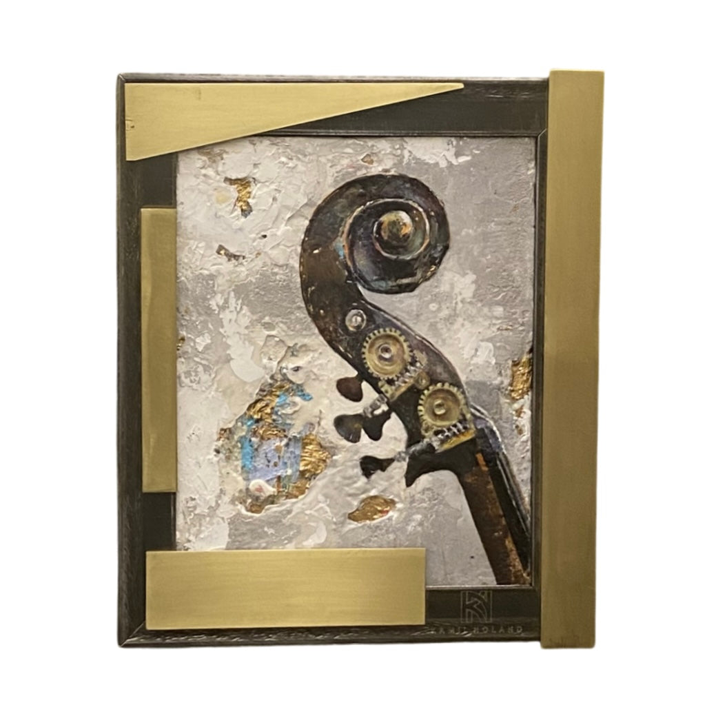 Mixed media collaborative work of art by Kamil Noland on canvas surrounded by a wood, steel, and brass frame sculpture. This piece measures 10”x12”.