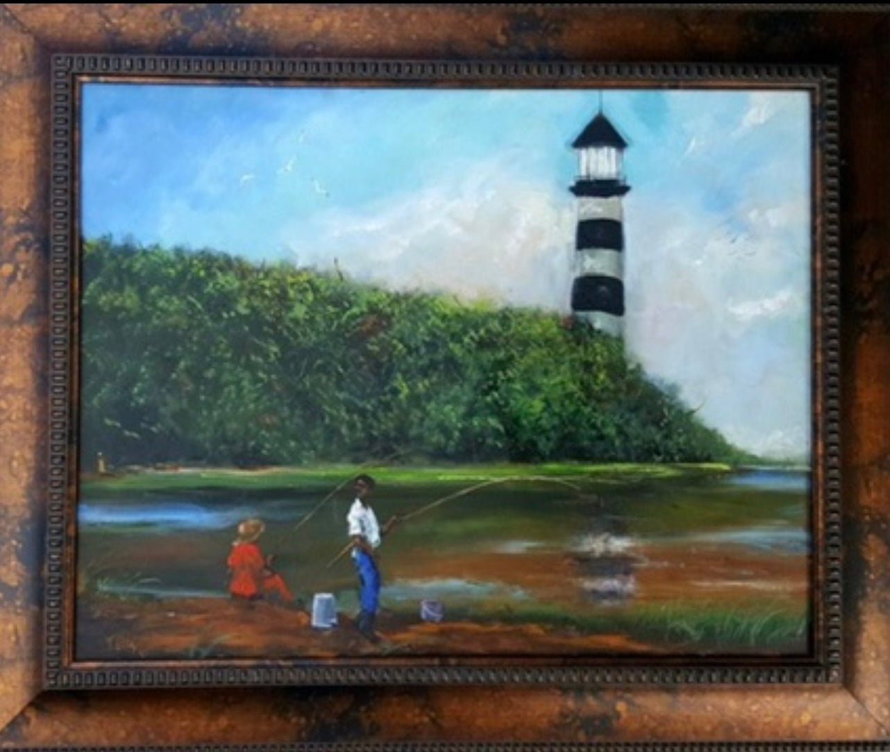 “Fishing Near the Lighthouse” by Ted Ellis measuring 24”x30” in oil on board