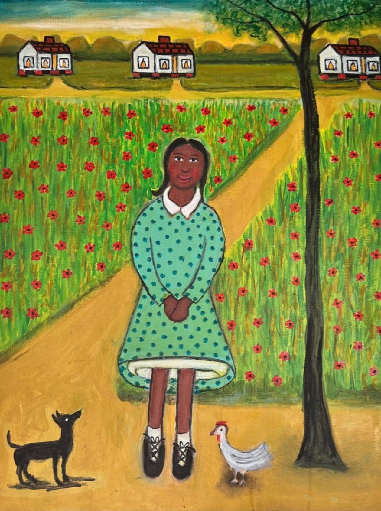 “Girl With Chicken and Dog” by Lorenzo Scott measuring 24”x21” in oil on canvas