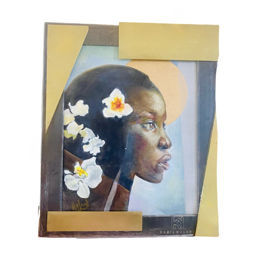 Mixed media collaborative work of art by Kamil Noland on canvas surrounded by wood, steel, brass frame sculpture This piece measures10”x12”.
