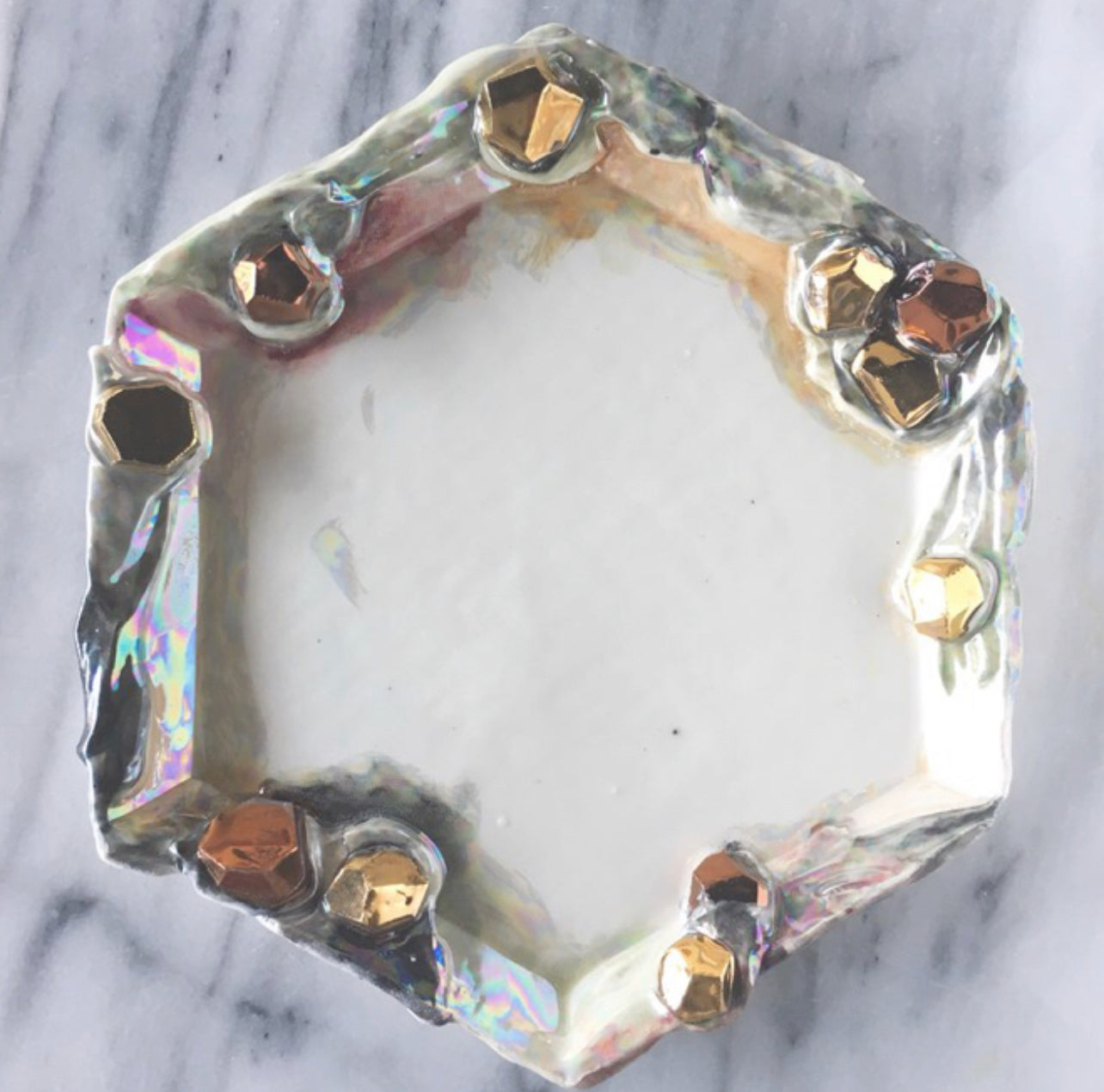 Hexagon Dinner Plate by Tiffany Thomas in translucent porcelain clay featuring 24k gold glaze detail