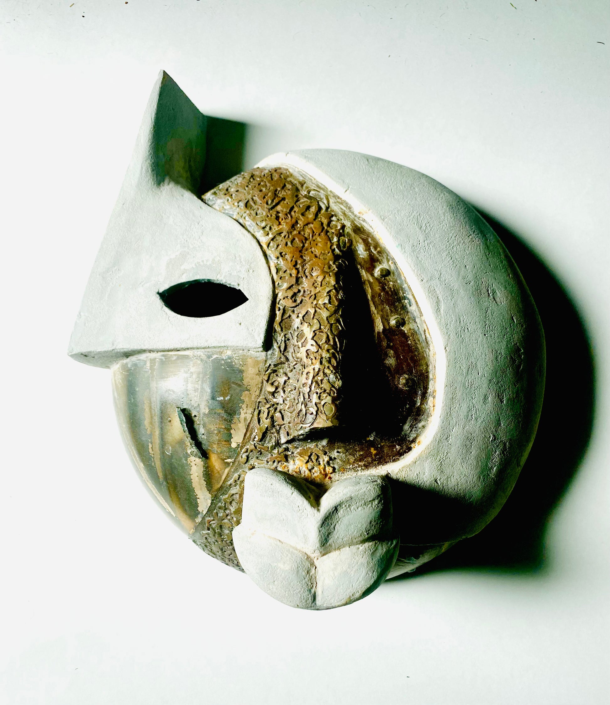 Mixed media mask in steel, concrete, and oil by artist collaboration Kamil Noland. Mask weighs 10-15 lbs and measures 12” in diameter