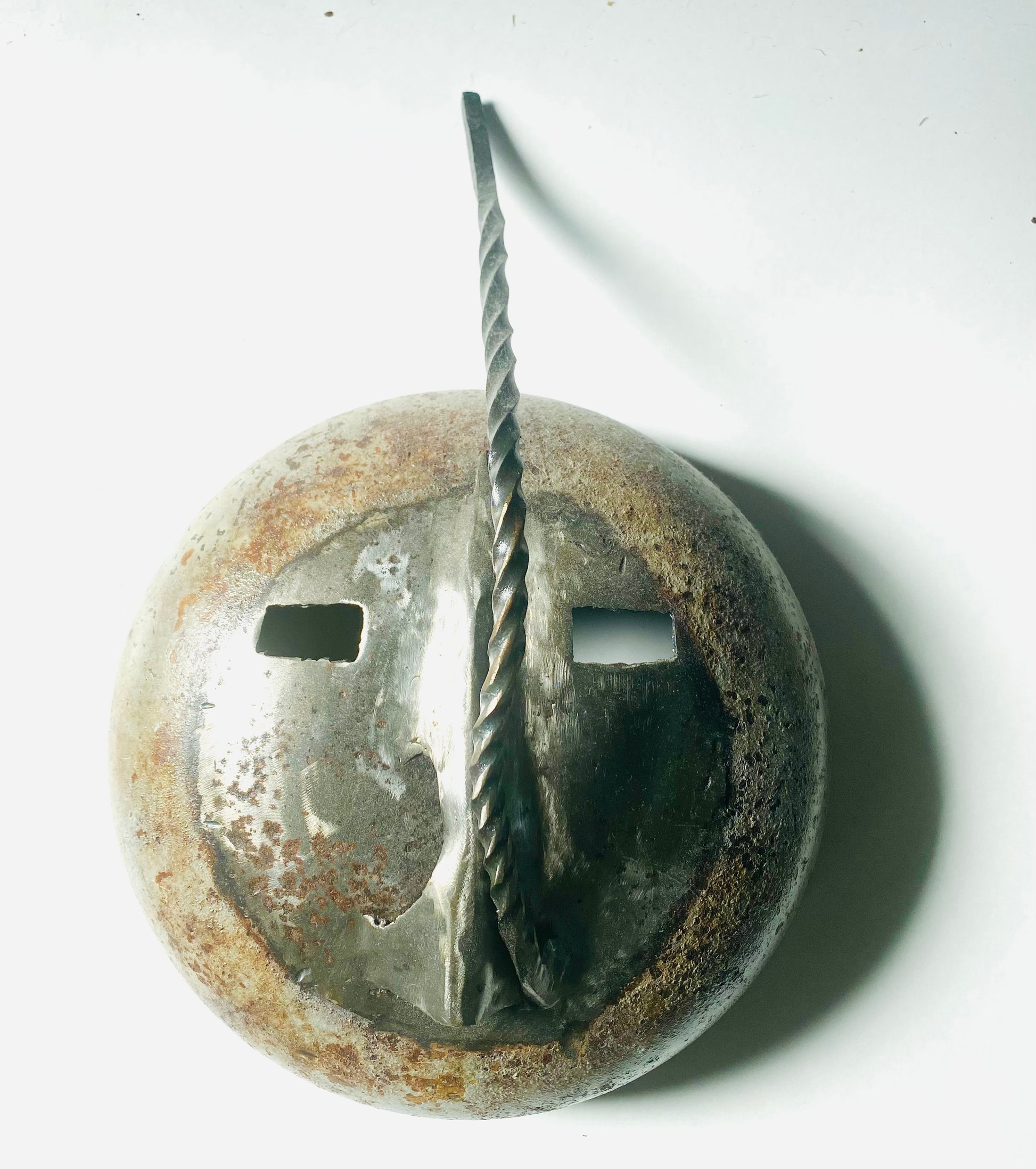 Mixed media mask in steel by artist collaboration Kamil Noland. Mask weighs 10-15 lbs and measures 12” in diameter