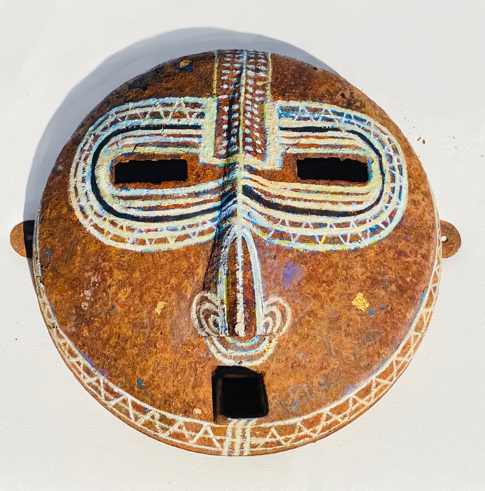 Mixed media mask in steel and oil by artist collaboration Kamil Noland. Mask weighs 10-15 lbs and measures 12” in diameter